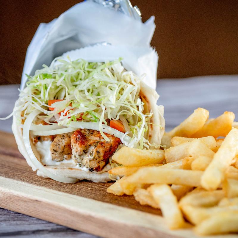A wrap with lettuce, tomato, feta, black olives, grilled chicken, and topped with Greek dressing