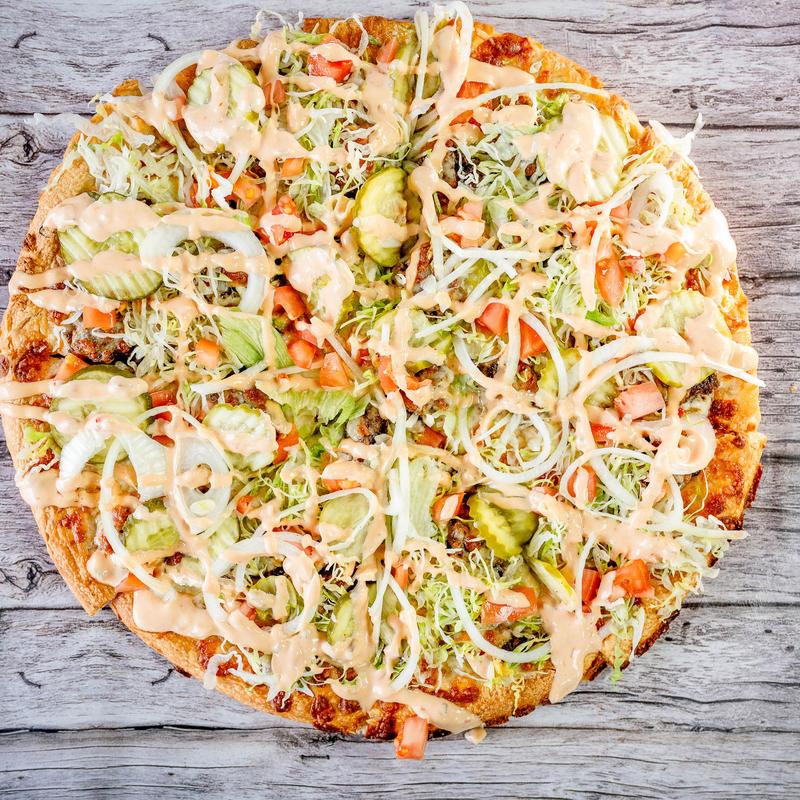 A delicious pizza. With a nacho cheese base, taco beef, our special blend pizza cheese, topped with lettuce, tomatoes, jalapeños, Mexican cheese, and Doritos